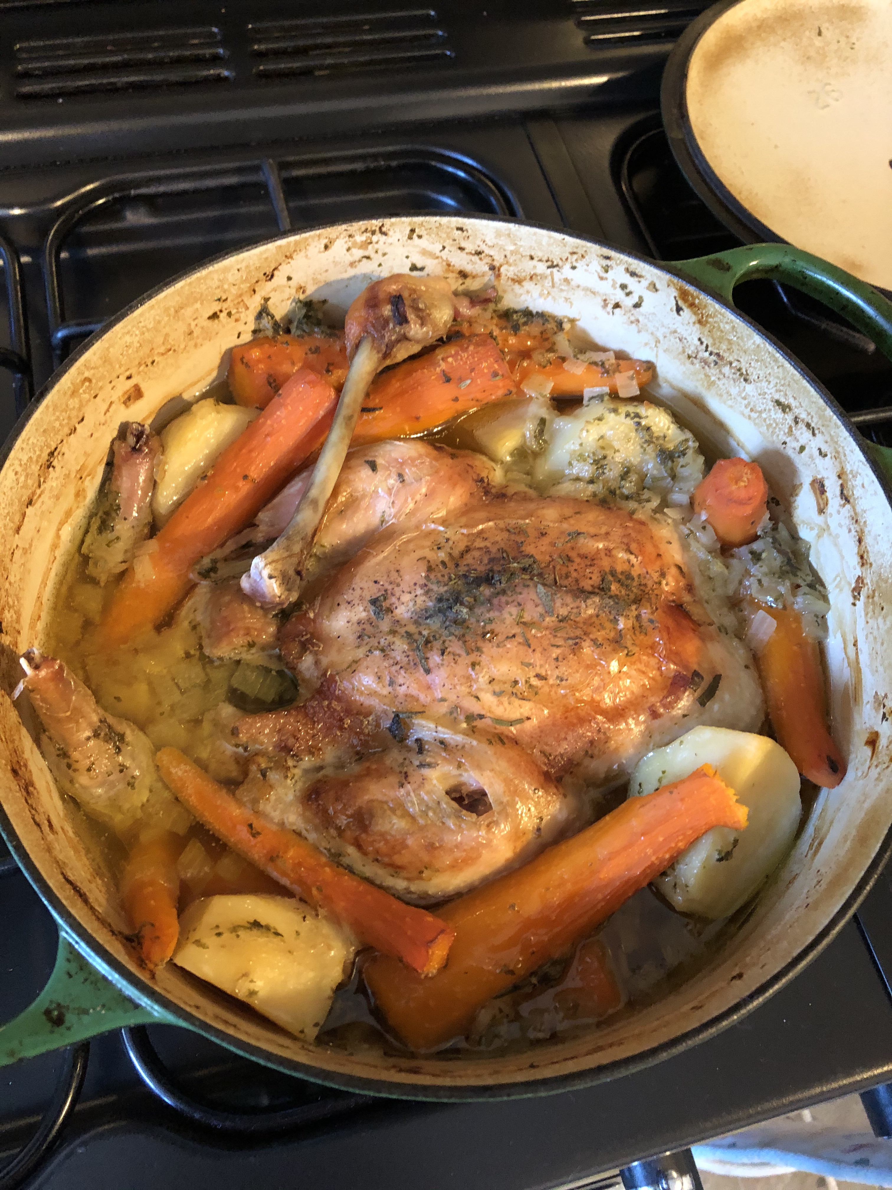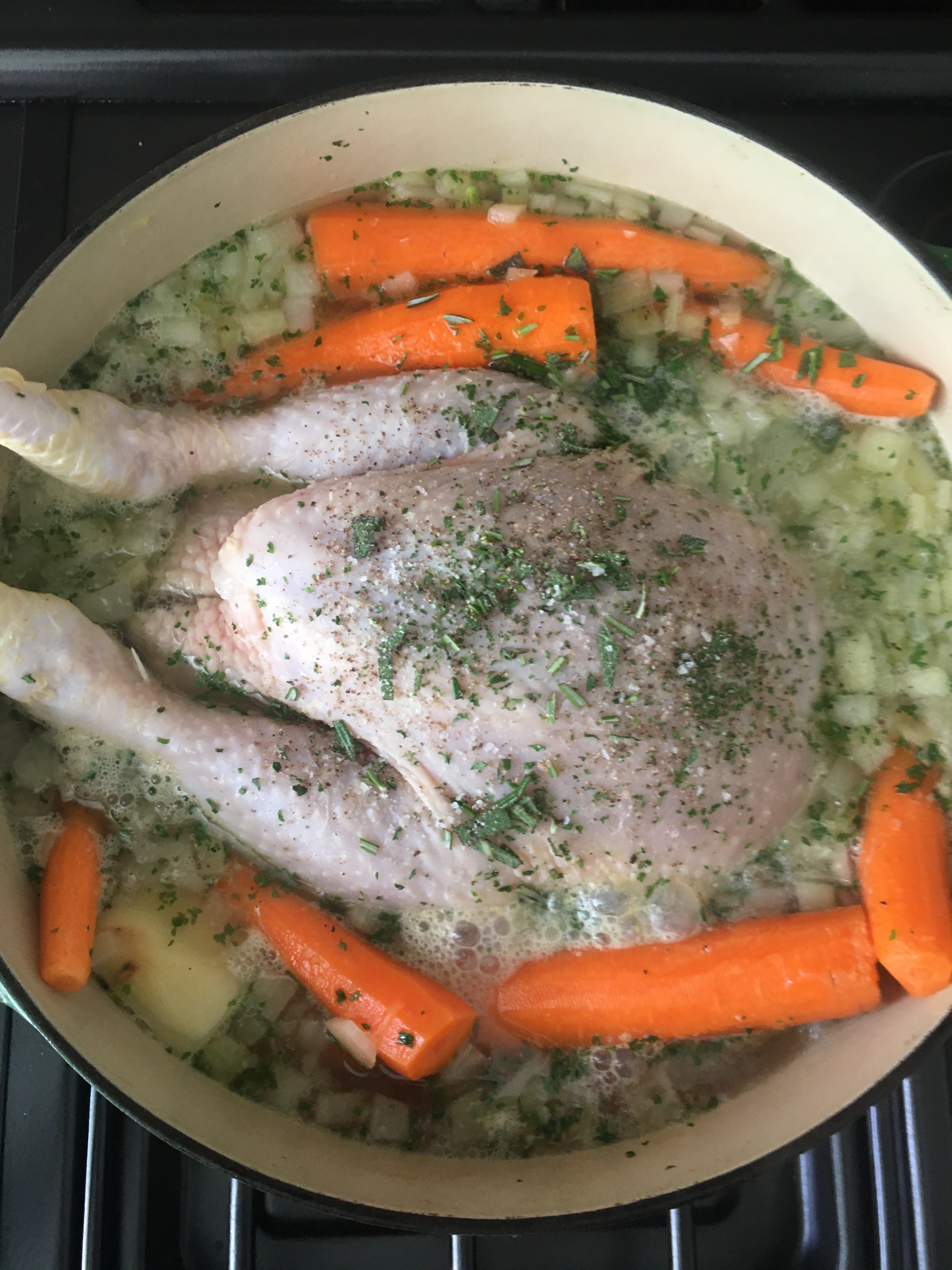- Put the pepper on the chicken and the salt mainly in the water. You can put the herbs in and the potatoes and carrots.